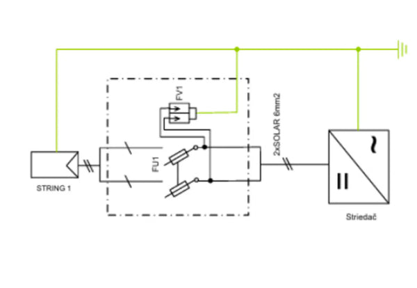Jednopólová schéma zobrazuje zapojenie jedného FV stringu cez poistku (nadprúdová ochrana) a prepäťovú ochranu (SPD) do striedača. Poistka chráni systém pred nadmerným prúdom alebo skratom, zatiaľ čo SPD odvádza nebezpečné prepätia do zeme. Výsledkom je bezpečný a spoľahlivý prenos energie z panelov do meniča.