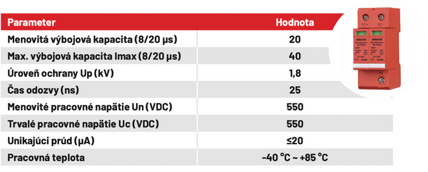 Vyznačuje sa vysokou vybíjacou kapacitou až 40 kA (8/20 μs), krátkym časom odozvy 25 ns a nízkou úrovňou ochrany len 1,8 kV. Vďaka širokému rozsahu pracovných teplôt od –40 °C do +85 °C je vhodná na dlhodobú a spoľahlivú prevádzku aj v náročných podmienkach.