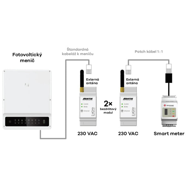 Systém znázorňuje bezdrôtovú komunikáciu medzi fotovoltickým meničom a smart metrom pomocou RS485 zbernice. Štandardný kábel vedie signál z meniča do bezdrôtového modulu, ktorý zabezpečuje prenos dát na frekvencii 2,4 GHz. Druhý modul prijíma signál a prenáša ho cez patch kábel do smart metra.