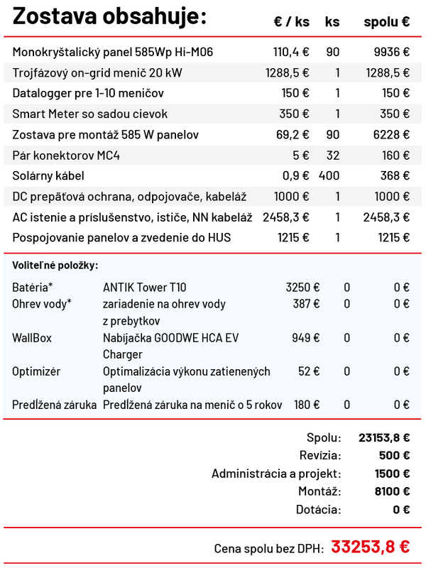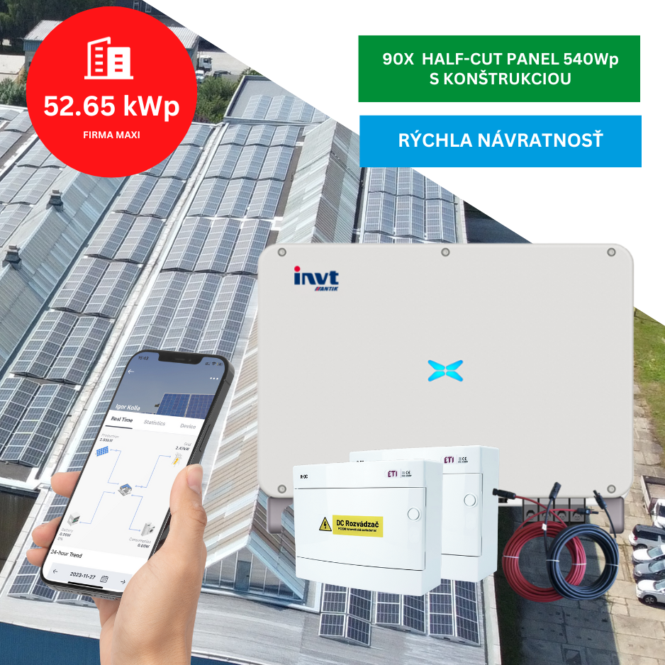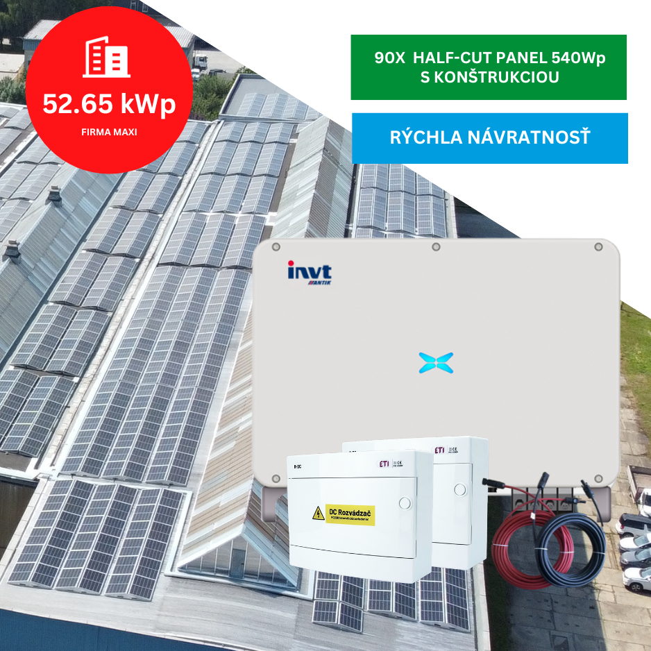 Fotovoltický systém pre firmy s 10-ročnou zárukou a max. výkonom 49,5 kW, tvorený 50 kW 3-fázovým on-grid meničom, 90 ks monokryštalickými silver panelmi s výkonom 585 Wp, strešnou konštrukciou podľa typu vašej strechy a kompletnou elektroinštalačnou sadou.