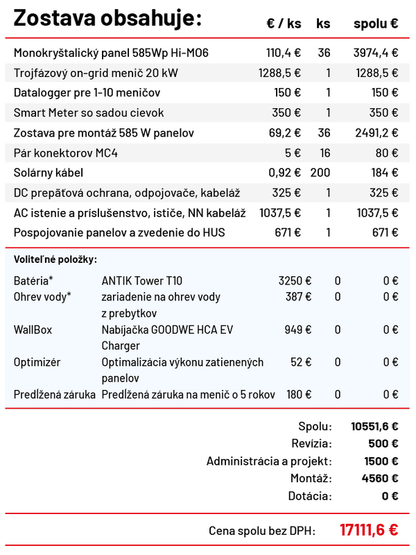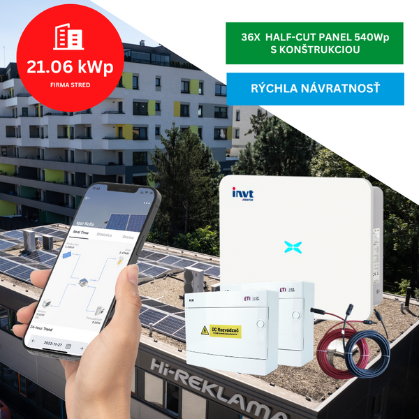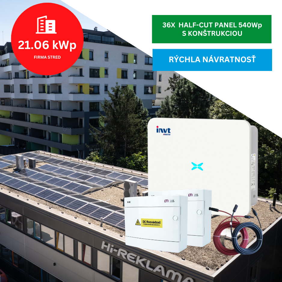 Fotovoltický systém pre firmy s 10-ročnou zárukou a max. výkonom 21.06kW, tvorený 25kW 3-fázovým on-grid meničom, 36ks monokryštalickými silver panelmi s výkonom 585Wp, strešnou konštrukciou podľa typu vašej strechy a kompletnou elektroinštalačnou sadou. Montáž trvá cca 2 dni.