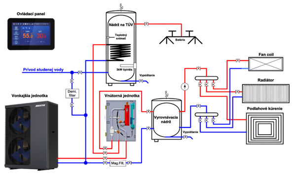 Schéma zapojenia tepelného čerpadla vzduch-voda zobrazuje prepojenie jednotlivých komponentov systému, ako sú samotné čerpadlo, obehové čerpadlá, zásobník teplej vody, expanzná nádoba a riadiaca jednotka.