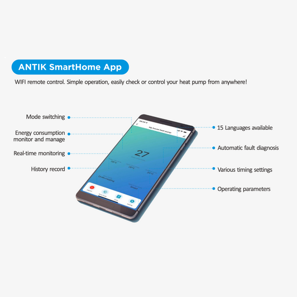 ANTIK SmartHome® aplikáciou máte svoje tepelné čerpadlo vždy pod kontrolou – nech ste kdekoľvek. Sledujte teploty, nastavte režim prevádzky, upravte teploty vody alebo dolaďte pokročilé parametre priamo z mobilu.