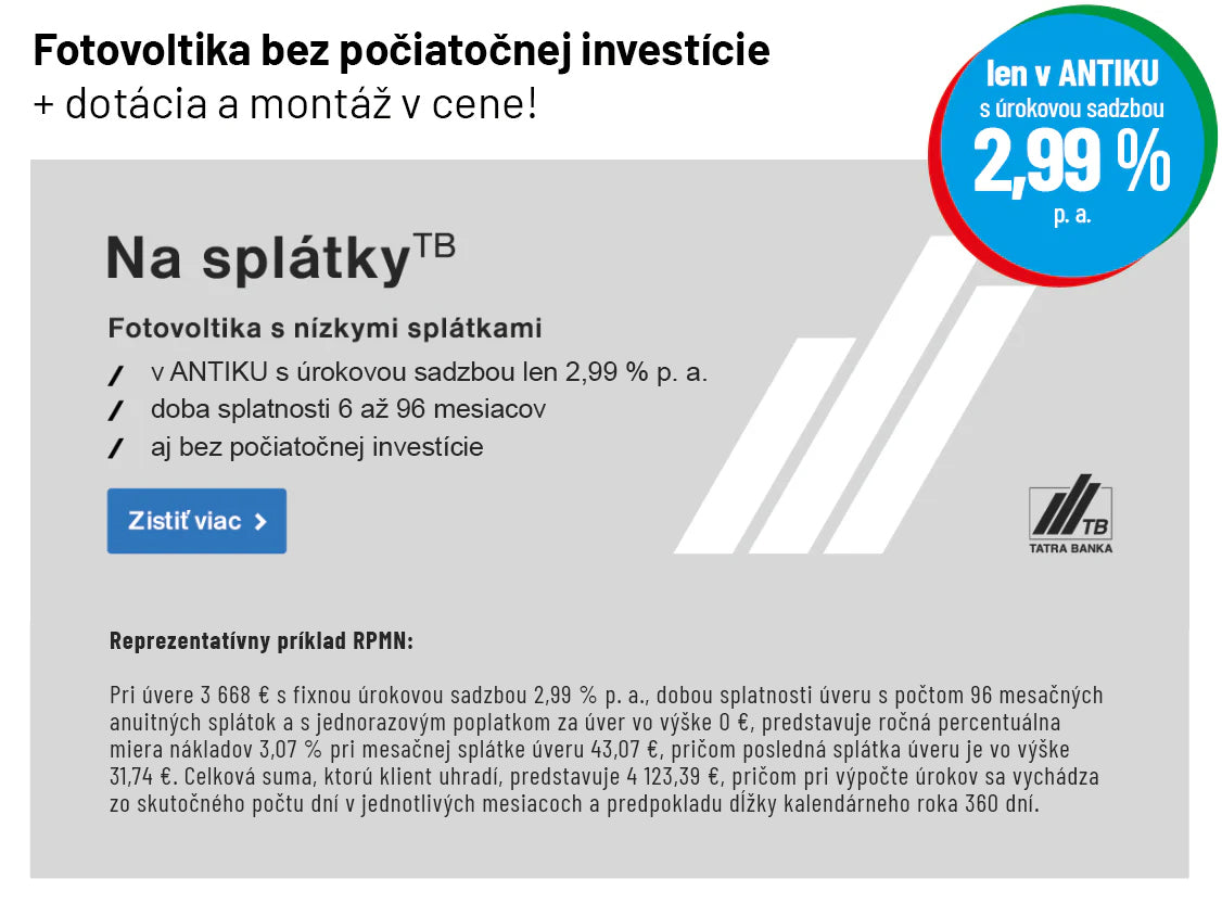 Fotovoltiku od ANTIKU získate vždy najvýhodnejšie. Navyše máte možnosť samoinštalácie alebo najnižších splátok na trhu s úrokom 2,99 % p.a. len v ANTIKU.