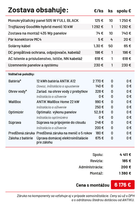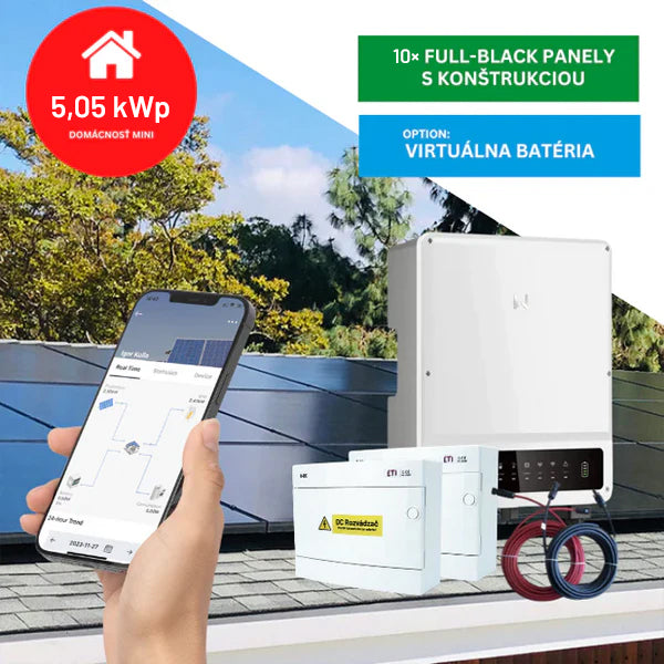Fotovoltický systém s 10-ročnou zárukou pre domácnosť s max. výkonom 5,05 kW (s možnosťou rozšírenia až do 10 kW), tvorený 10 kW 3-fázovým hybridným meničom, 10 ks dizajnovými full black panelmi s výkonom 505 Wp, strešnou konštrukciou podľa typu strechy a kompletnou elektroinštalačnou sadou.