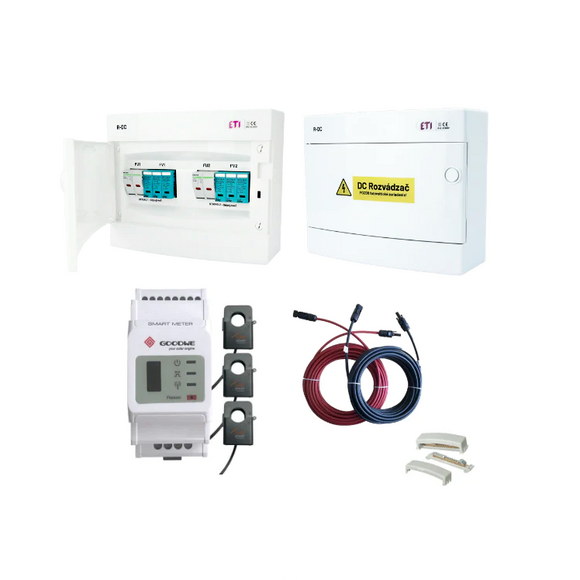 Elektroinštalačná sada obsahuje DC a AC rozvádzače, 25m kabeláže pre každý DC string, zemniacu svorkovnicu, smart meter a vývodový istič.